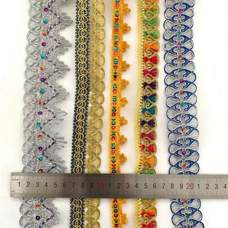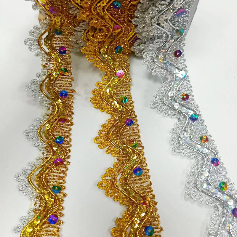 Kledingaccessoires Goud en zilveren metalen rand kanten trim multicolor pailletten gouddraad metalen kanten trim versierd met gouden en zilveren bicolored metalen draden en zeven kleuren pailletten, het creëert een prachtig en oogverblindend randeffect. Het is geschikt voor de decoratie van manchetten, kragen en zomen van high-end kleding zoals avondjurken, podiumkostuums en trouwjurken. Het materiaal is licht en flexibel, vervaagt of pil niet en ondersteunt aangepaste breedte en patronen, waardoor een luxueuze glans aan de kleding wordt toegevoegd.