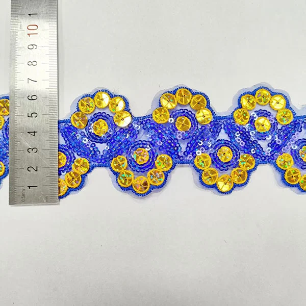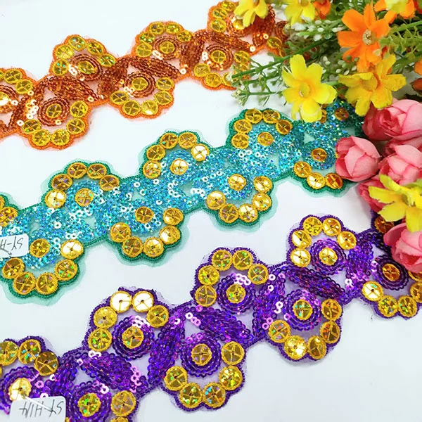 Borduurwerk Multicolor -pailletten Mesh Lace Turming is een decoratief type kantafwerking met ingewikkelde borduurwerk, kleurrijke pailletten en een gaasbasis. Dit type trimmen wordt vaak gebruikt in modeontwerp en knutselen om een vleugje schittering en glamour toe te voegen aan kleding, accessoires en woningdecoratieven.