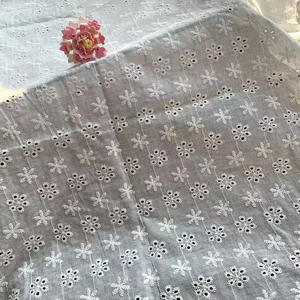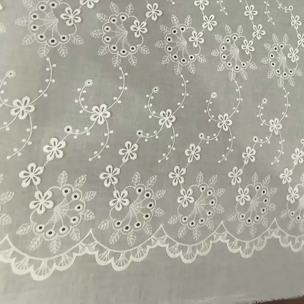 Wit katoenen kanten borduurwerk oogje stof voor jurk Deze elegante kanten stof heeft delicaat borduurwerk en oogjesnijwork, waardoor een ademend, lichtgewicht materiaal perfect is voor jurken, blouses en bruidskleding. De ingewikkelde bloemenpatronen en geschulpte randen voegen een romantische, vintage charme toe, terwijl het natuurlijke katoen zorgt voor zachtheid en comfort.